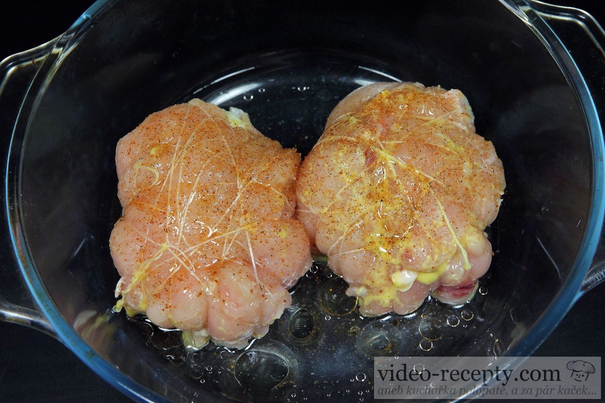 - Vložte do pekáčku nebo varné mísy, ze všech stran mírně osolte, polijte asi 3 lžícemi oleje a podlijte asi 5 lžícemi vody.