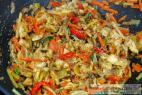 - Vložíme maso i s marinádou a restujeme do měkka. Při restování podléváme velmi malým množstvím vody tak, aby směs na pánvi byla pouze s neznatelnými stopami vody. Když je maso měkké, tak jej podle chuti dosolíme a přihodíme orestovanou zeleninu. Pokud pokrm není dost horký, pak jej mícháme a prohříváme, potom ihned podáváme.