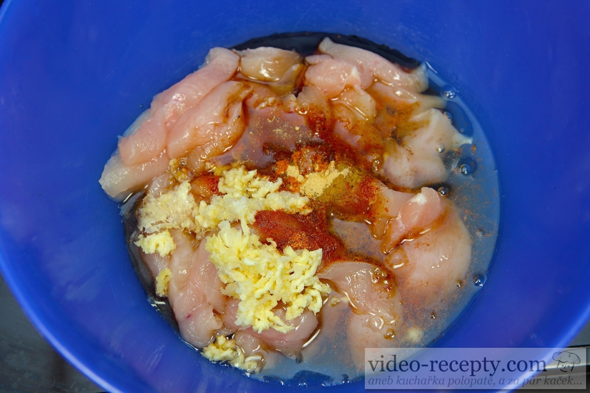 - Maso nakrájíme na nudličky a přidáme sojovou omáčku, worcester, zázvor, koření pěti vůní, prolisovaný česnek, bílek, med, solamyl a promícháme. Necháme alespoň hodinu marinovat, ideální doba je kolem tří hodin. Otestovali jsme marinování 48 hodin s úžasným výsledkem - maso bylo hotové za poloviční dobu a velmi křehké.