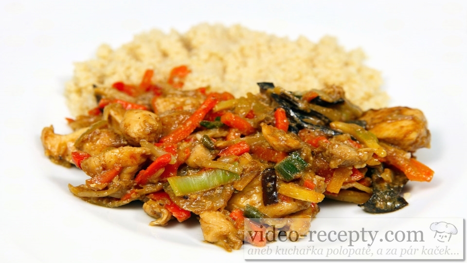 - Vložíme maso i s marinádou a restujeme do měkka. Při restování podléváme velmi malým množstvím vývaru nebo vody tak, aby směs na pánvi byla pouze s neznatelnými stopami vody. Když je maso měkké, tak jej podle chuti dosolíme a přihodíme orestovanou zeleninu. Pokud pokrm není dost horký, pak jej mícháme a prohříváme, potom ihned podáváme.