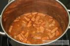 - Nyní přilijeme tolik vody, kolik chceme mít hotové omáčky, a v celém dalším průběhu budeme tuto hladinu udržovat. Dusíme dokud maso není téměř měkké.