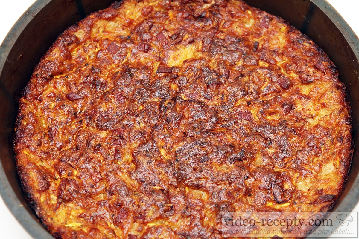 - Asi 800 gramů cukety nastrouháme do větší mísy, přidáme dvě nadrobno nakrájené cibule, 250 g uzeniny podle chuti, 150 gramů tvrdého sýra, 150 g polohrubé mouky, 1/2 pytlíku prášku do pečiva, 2 vejce, 1/2 lžičky soli, 2 lžičky majoránky, 4 stroužky prolisovaného česneku, 100 ml oleje a dobře promícháme.