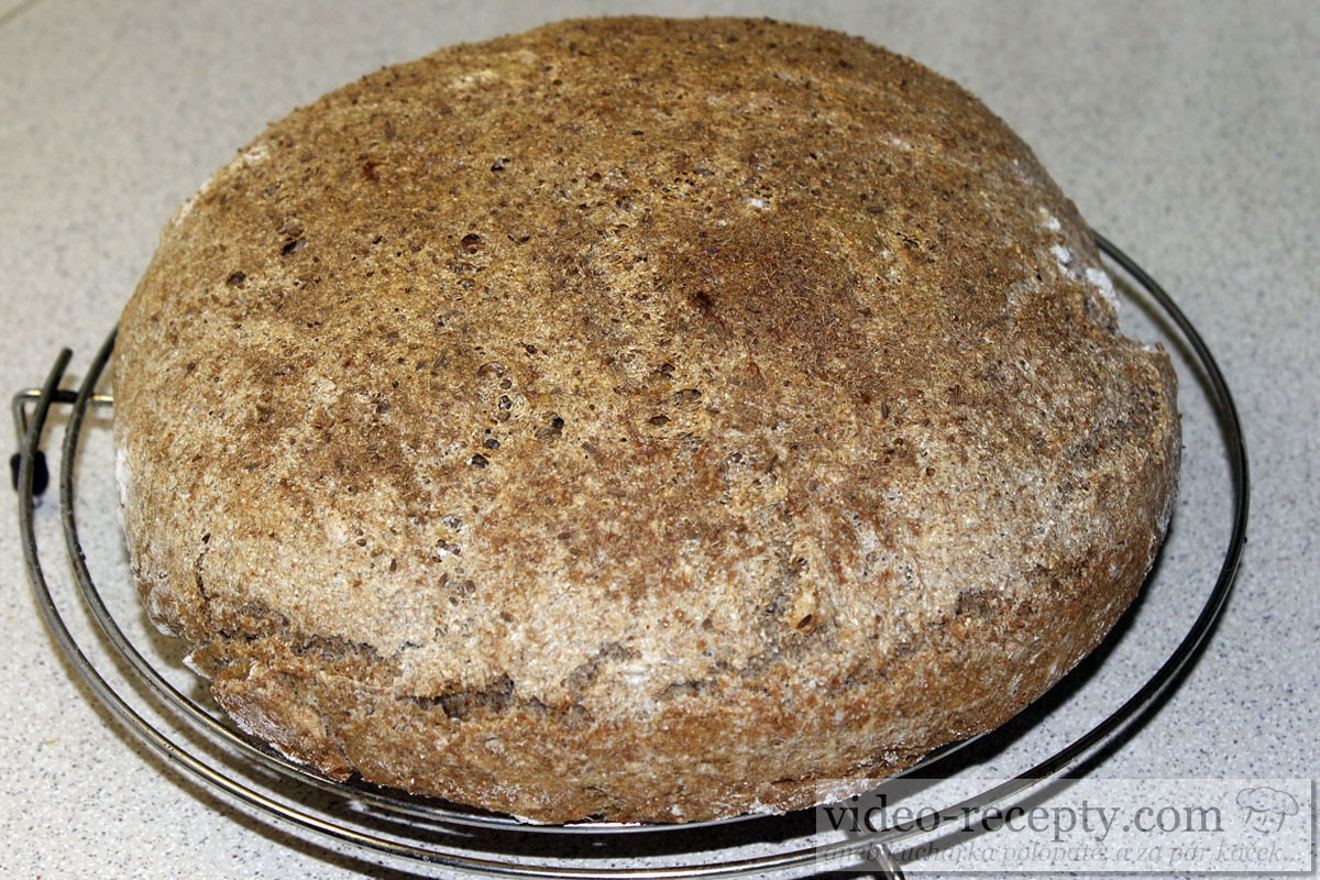 - Udělejte si směs vody a soli – asi na 50 ml vody 1/2 lžičky soli. Touto slanou vodou potírejte budoucí kůrku. Čím hladší, tím méně prasklin. (Ty jsou však na chlebu to nejlepší…) Potom ještě posypejte drceným kmínem, popřípadě slunečnicovým semínkem a také se nám osvědčilo posypat budoucí kůrku jedním rozdrceným „knekebrotem“…