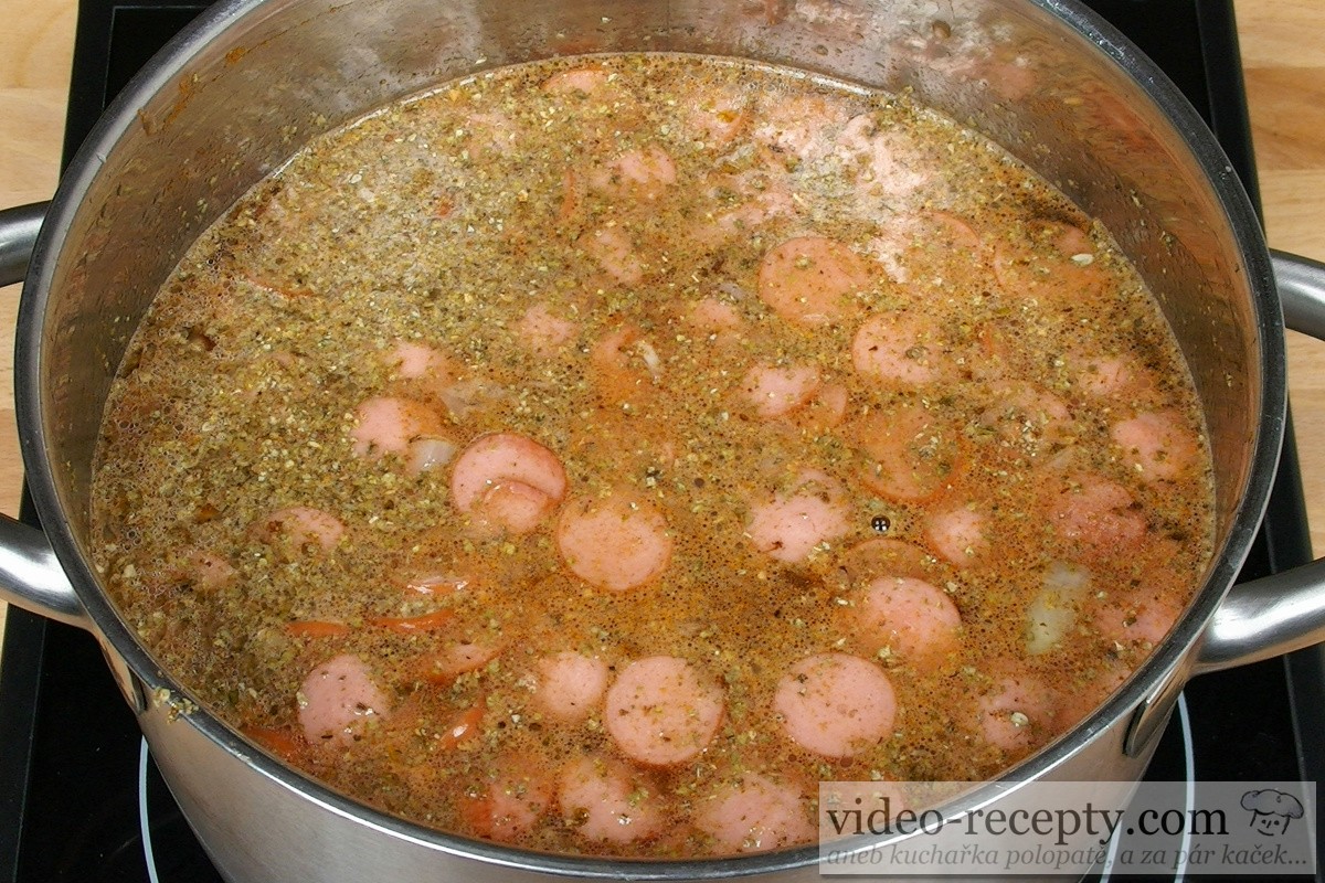 - Přilijeme 2,5 litru vody, ale nejlépe je alespoň 30 % tohoto objemu nahradit vývarem. Pokud jej však nemáme, polévka bude i tak dobrá.