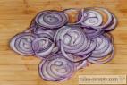 - Maso necháme chvíli odpočinout, a mezi tím si nakrájíme zeleninu. Cibuli na tenké plátky a rajčata na plátky asi 3 mm silné. Ledový salát nakrájíme na menší kousky podle videa.