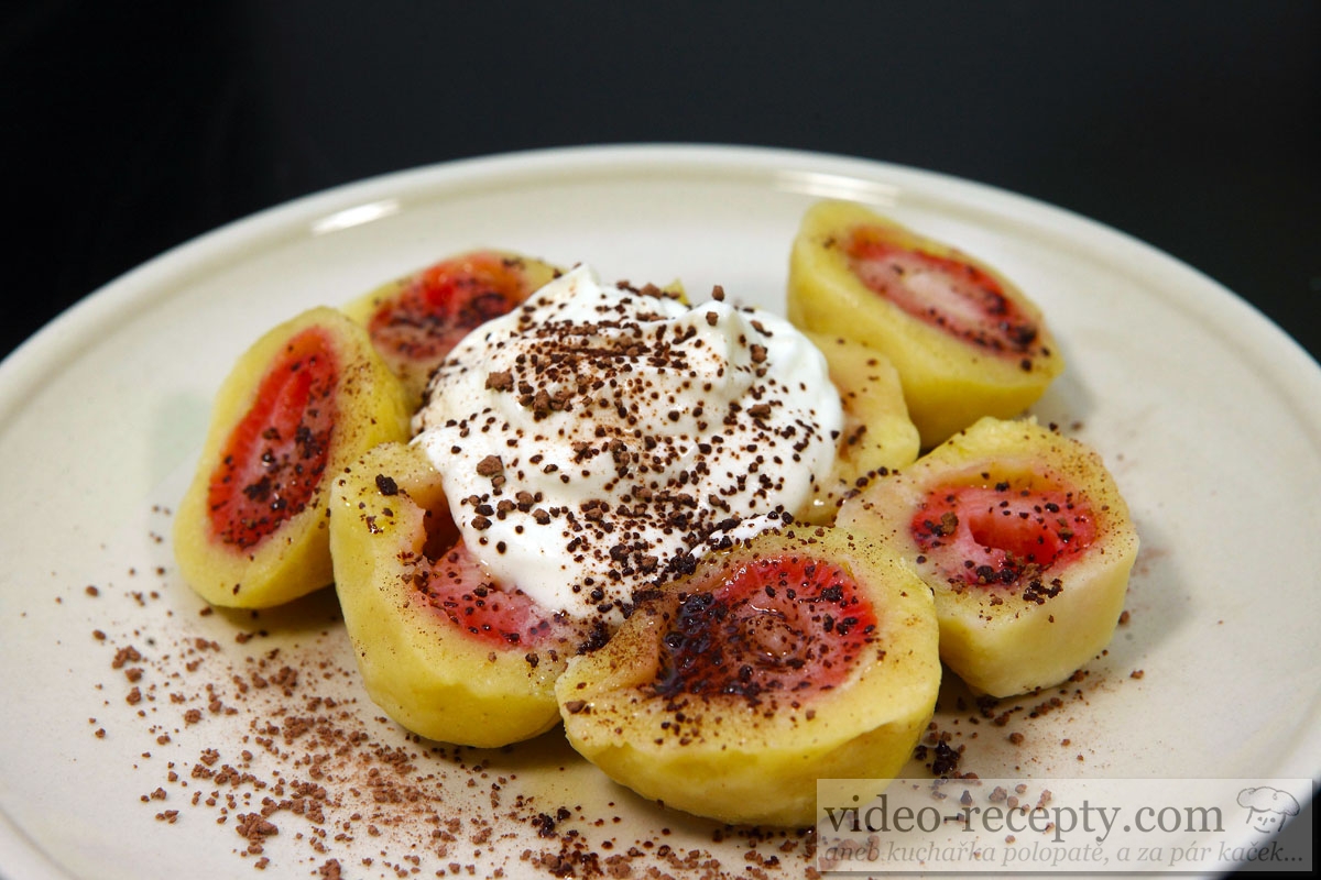 - Podle videa ukrojíme kousek těsta velký asi jako běžný bramborový knedlík a uděláme z něj placičku do které zabudujeme jahodu. Pokud jsou jahody menší, použijeme jich podle potřeby více.