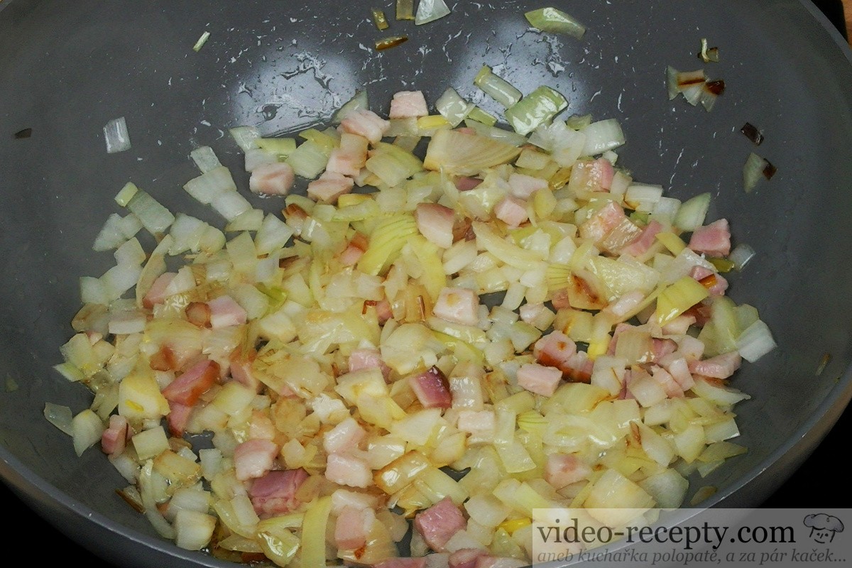 - Jemná kuřecí játra s uzeninou zahájíme tím, že do hrnce, nebo na vysokou pánev dáme lžíci sádla nebo oleje, přidáme 2 středně velké cibule, 20 g anglické slaniny a restujeme při teplotě 120°C asi 3 minuty za občasného zamíchání.