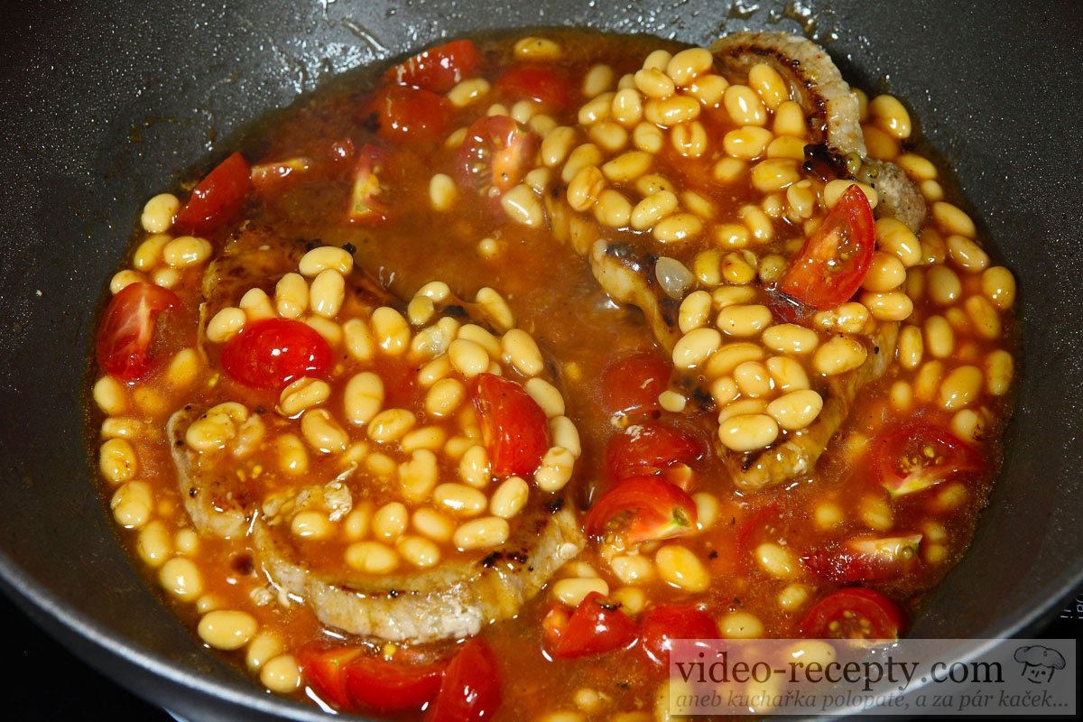 - Když jsou plátky z obou stran osmažené, tak přidáme fazole v tomatě a rajčata. Pokud použijeme rajčata normální, potom je vhodné je použít bez slupky. Tu odstraníme jednoduše tak, že rajčata hodíme na pár vteřin do vařící vody. Slupka jde pak velmi snadno dolů. Přidáme ještě nadrobno nakrájené feferonky.