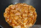 - Na pánev rozpálenou na 120°C přihodíme maso i s tekutinou a za občasného promíchávání restujeme až maso ztratí barvu. Kdybychom na pánvi měli podezřele málo resp. téměř žádnou tekutinu, trochu vody přilijeme.