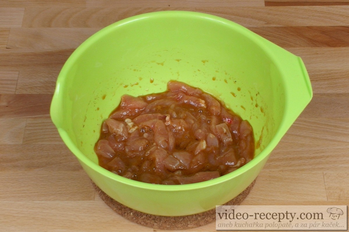 - Kuřecí čínu s mrkví zahájíme tím, že do misky dáme 1 bílek, 2 lžičky solamylu, 2 lžíce sojové omáčky, 1 lžíci worcesterové omáčky, 1 lžíci citronové šťávy, 1/4 lžičky zázvoru, 1/8 lžičky chilli, 1/8 lžičky mleté skořice a 300 g kuřecího masa. Důkladně promícháme a marinujeme alespoň hodinu. Nejlépe je však maso marinovat několik hodin v chladu.