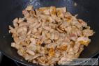 - Pánev rozehřejeme na 140°C, nalijeme 2 lžíce oleje a přihodíme maso i s marinádou. Restujeme ho za občasného zamíchání, dokud není křupavé.