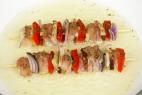 - Ingredience nakrájíme na přibližně stejně velké kousky, které střídavě napichujeme na špejle, nebo ocelové jehly.