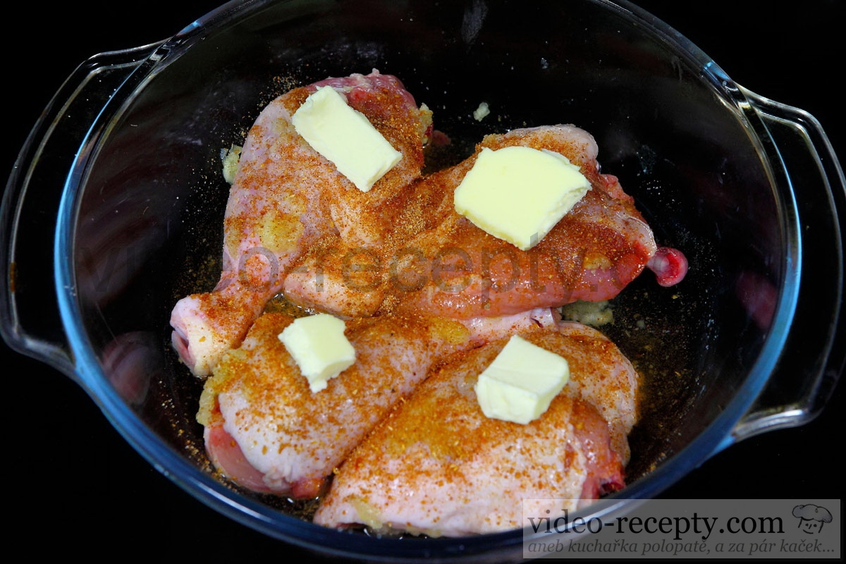 - Jednotlivá stehna rovnáme do zapékací misky nebo pekáčku a pak je posypeme grilovacím kořením.