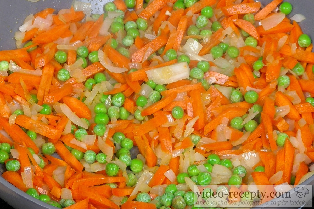 - Na pánvi rozpustíme sádlo a na něm zpěníme cibuli. Teplotu udržujeme na 120°C. Asi po dvou minutách restování přihodíme mrkev, hrášek, uzeninu, pórek a lžičku směsi koření na francouzské brambory