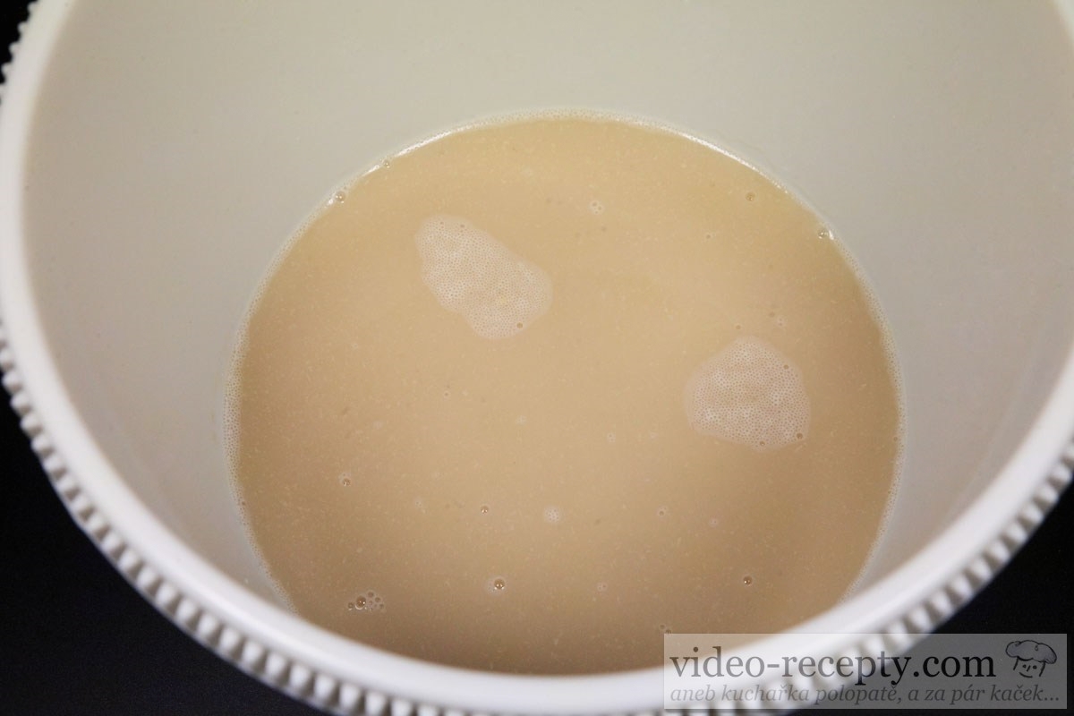 - Do misky dáme 50 ml vlažné vody, přidáme rozdrobené droždí, přidáme lžičku cukru, dobře rozmícháme a vložíme do míchačky.