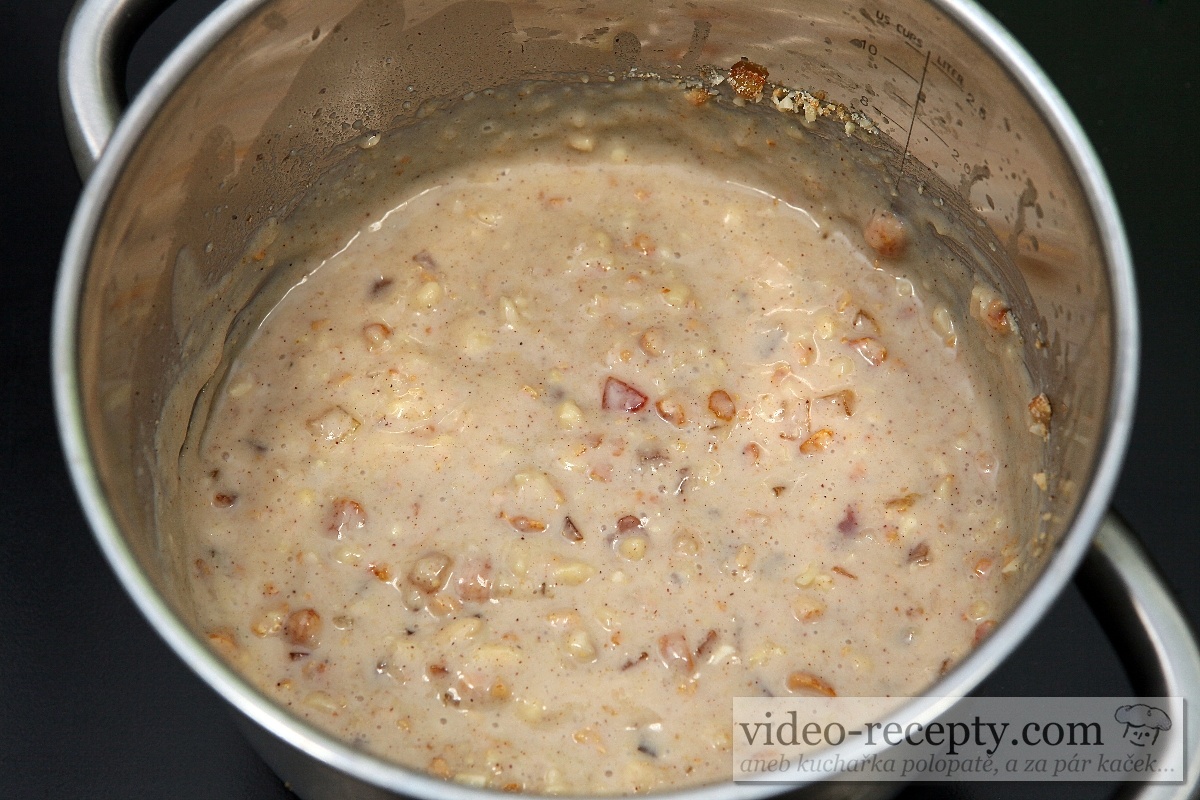 {text:"Použít můžeme mléko dle vlastní úvahy - polotučné, plnotučné nebo odtučněné...."}, kelímek smetany ke šlehání, balíček vanilkového cukru, balíček skořicového cukru, 80 gramů třtinového, hnědého nebo bílého cukru. Dále přidáme 2 lžíce medu, který může být včelí nebo pampeliškový a 40 gramů hladké mouky. - Metličkou pečlivě obsah hrnce rozmícháme do hladka.