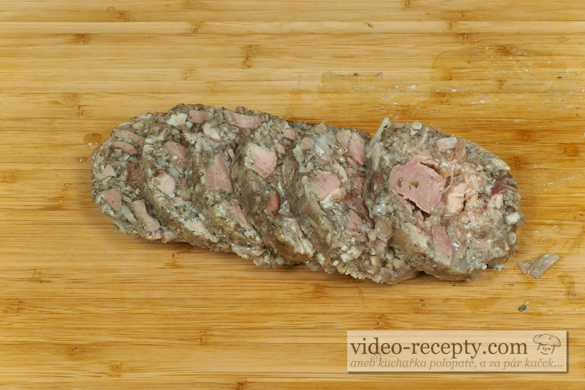 - Obalovanou tlačenku zahájíme nakrájením tlačenky. Tlačenku krájíme silnou asi 15 mm, bude pak při smažení dobře držet pohromadě.