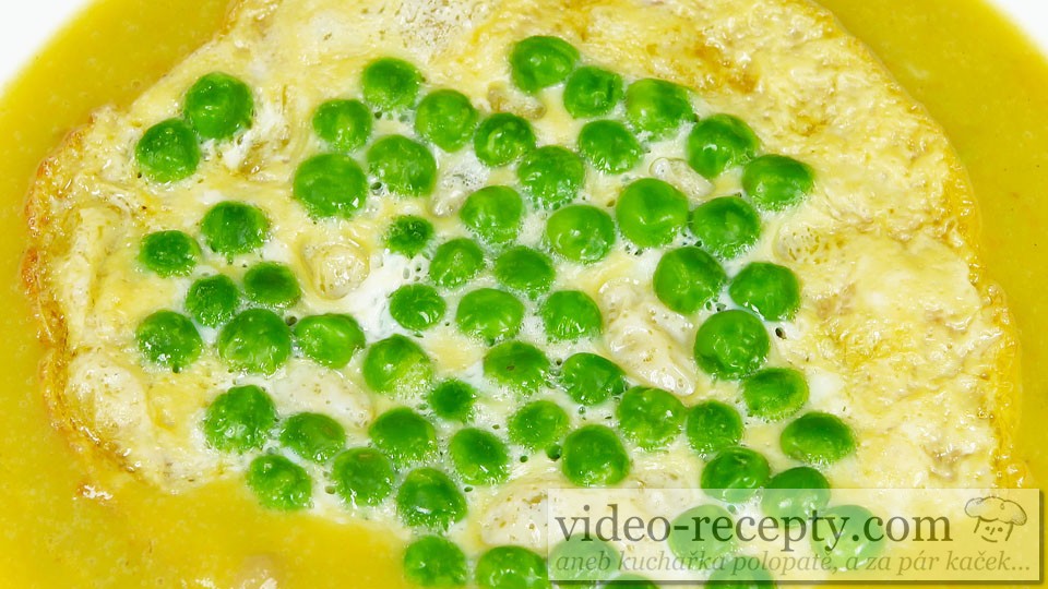 - Omeletu s hráškem zahájíme tím, že do misky dáme 150 g čerstvého, nebo rozmrazeného hrášku, 3 vejce, 1/3 lžičky soli a rozmícháme tak, aby se hrášek nezdeformoval.