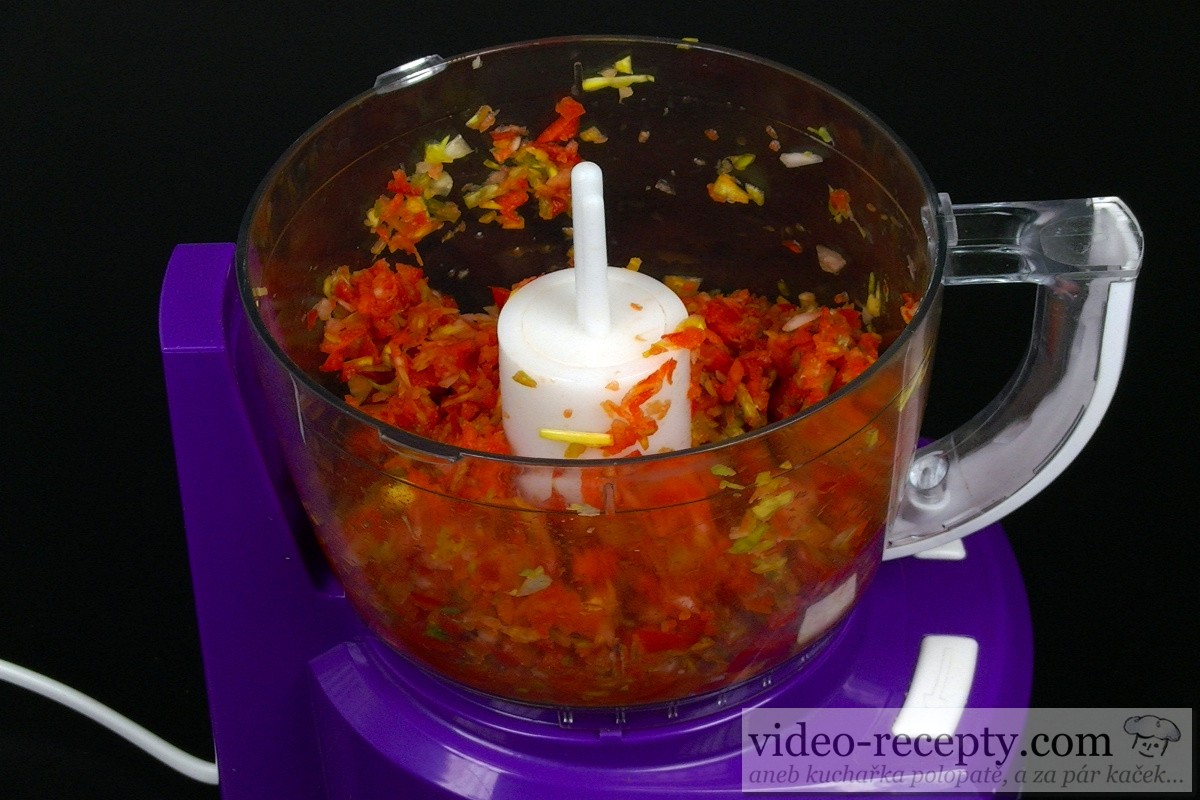 - Paprikovou pomazánku s pórkem zahájíme rozsekáním zeleniny. Do mixeru vhodíme 25 gramů cibule, 35 gramů pórku, 150 gramů papriky a vše rozsekáme na drobné kousky.