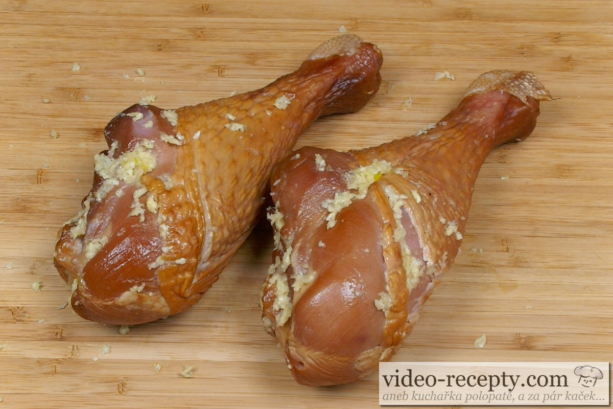 - Pečená uzená krůtí stehna zahájíme naříznutím stehen stejně jako na videu. Tento krok děláme proto, aby se česnek dostal i do spodnějších vrstev masa pod uzenou kůži.