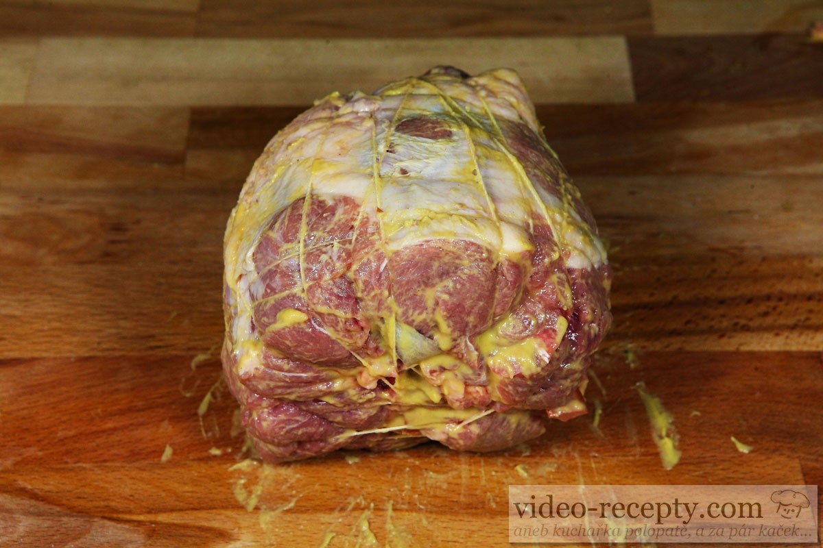 - Povrch namažeme hořčicí. Hořčice je slaná dost, proto uvnitř již nemusíme solit.
