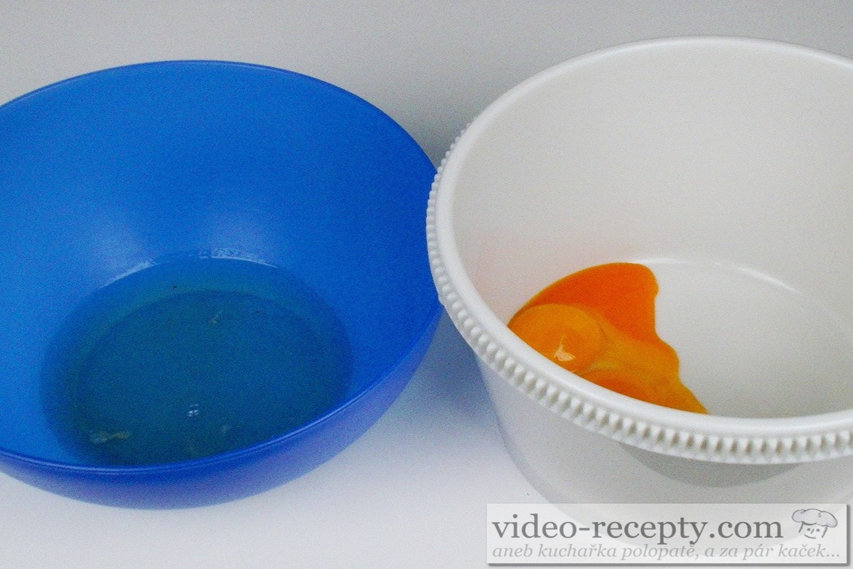 - Piškotový korpus se sodovkou zahájíme rozdělením vajec na žloutky a bílky. Ty rozdělíme do větších misek, ve kterých budeme potraviny šlehat. Bílky si rovnou ušleháme na opravdu tuhý sníh.