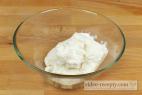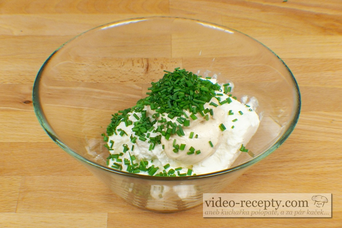 - Do misky dáme 250 g tvarohu, přidáme 2 lžíce majonézy, pažitku a našleháme.