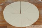 - Na vyválenou placku o síle asi 3 mm položíme talíř a podle něj vyřízneme kolečko. To rozdělíme na osm dílů.
