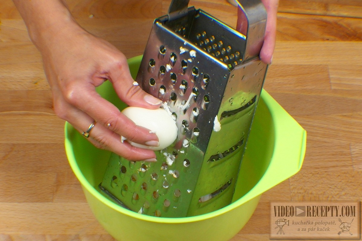 - Vejce uvařená na tvrdo nastrouháme do mísy, přidáme na drobno nakrájenou cibuli, na jemno nastrouhanou okurku, 2 lžičky plnotučné hořčice, 1/2 lžičky soli, 1/8 lžičky mletého pepře, 3 stroužky prolisovaného česneku a rozemleté škvarky.