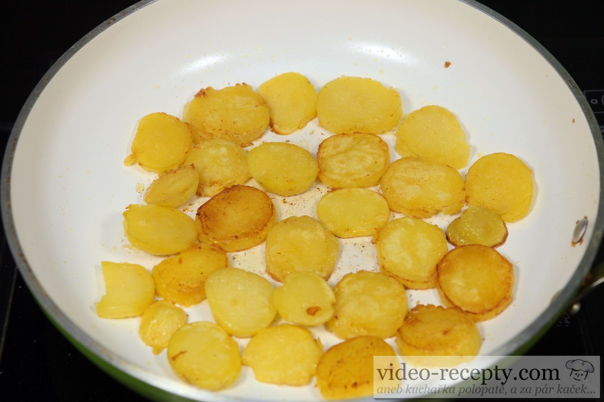 - Na pánev dáme lžíci másla, a na něm orestujeme oloupané a na kolečka nakrájené brambory. Vše je dobře vidět na videu. Pokud nemáme pánev extra velkou, smažte je po dvou porcích stejně jako na videu. Teplota po celou dobu je maximálně 120°C, ale lépe jen kolem 100°C , aby se máslo nepálilo.