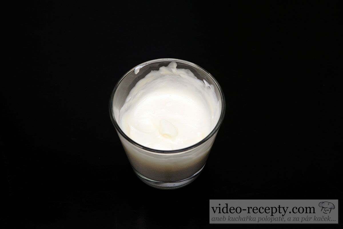- Mezitím si vyrobíme dresing. Smícháme 2 lžíce zakysané smetany, stejné množství majonézy a promícháme. Místo zakysané smetany také můžeme použít bílý jogurt se sníženým obsahem tuku.
