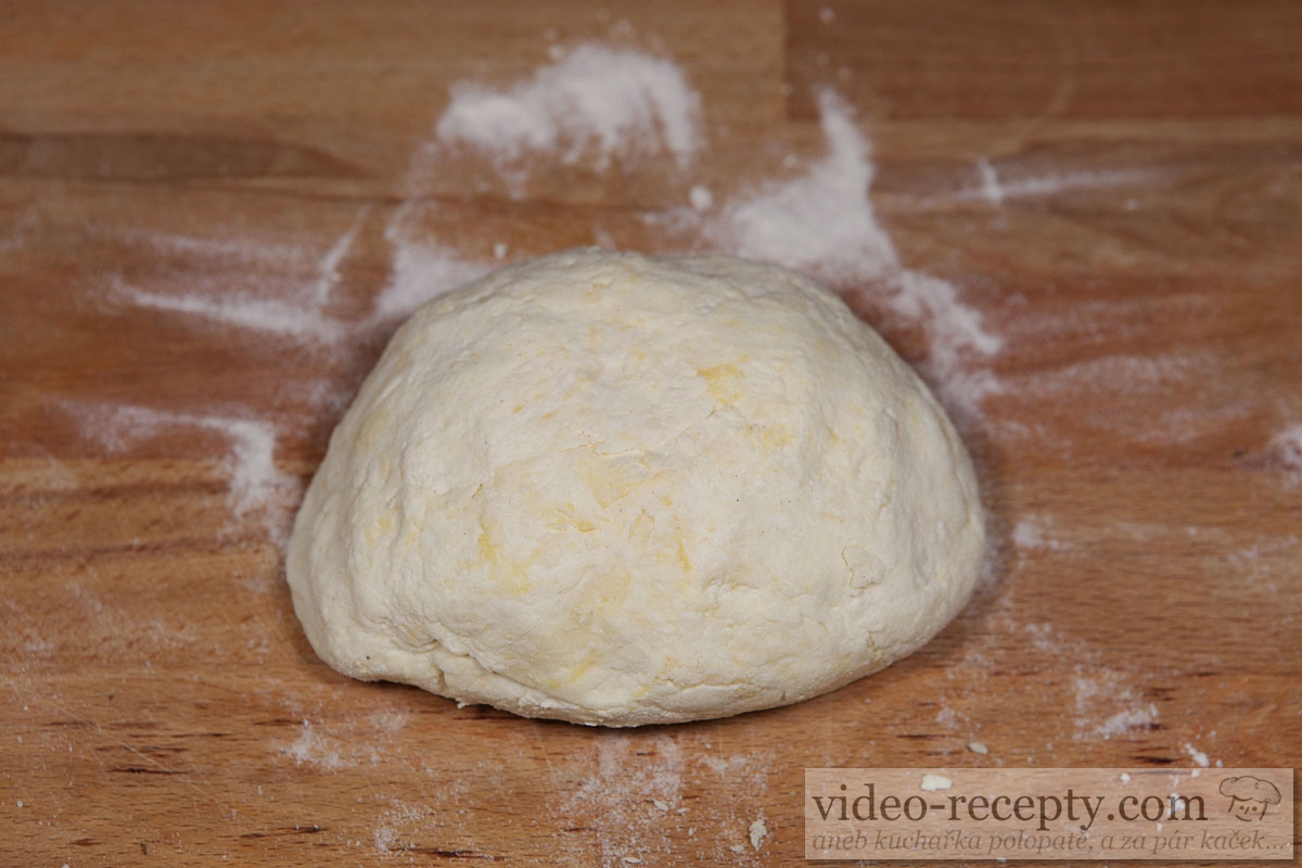 - Potom na vál nasypeme trochu polohrubé mouky a těsto na vál vyklopíme. Zapracujeme jej rukama na hladké těsto. To rozválíme válečkem na placku tlustou asi 5 mm. Pokud se nám těsto lepí na váleček, posypejte jej trochu více polohrubou moukou.