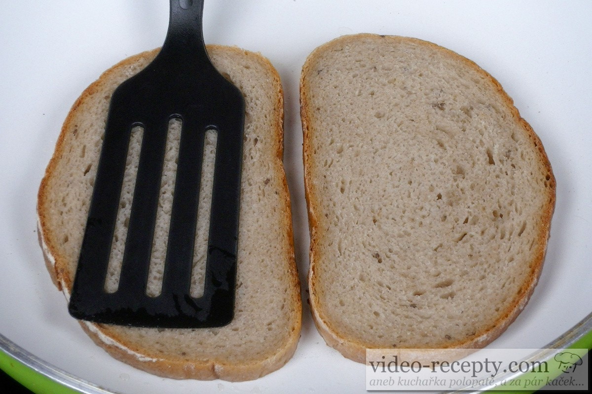 - Hotovou slaninu přendáme bez vypečeného tuku stranou a na výpeku osmažíme topinku z jedné strany. Aby i na malém množství tuku byla topinka propečená po celé ploše, je dobré ji zatížit například obracečkou.