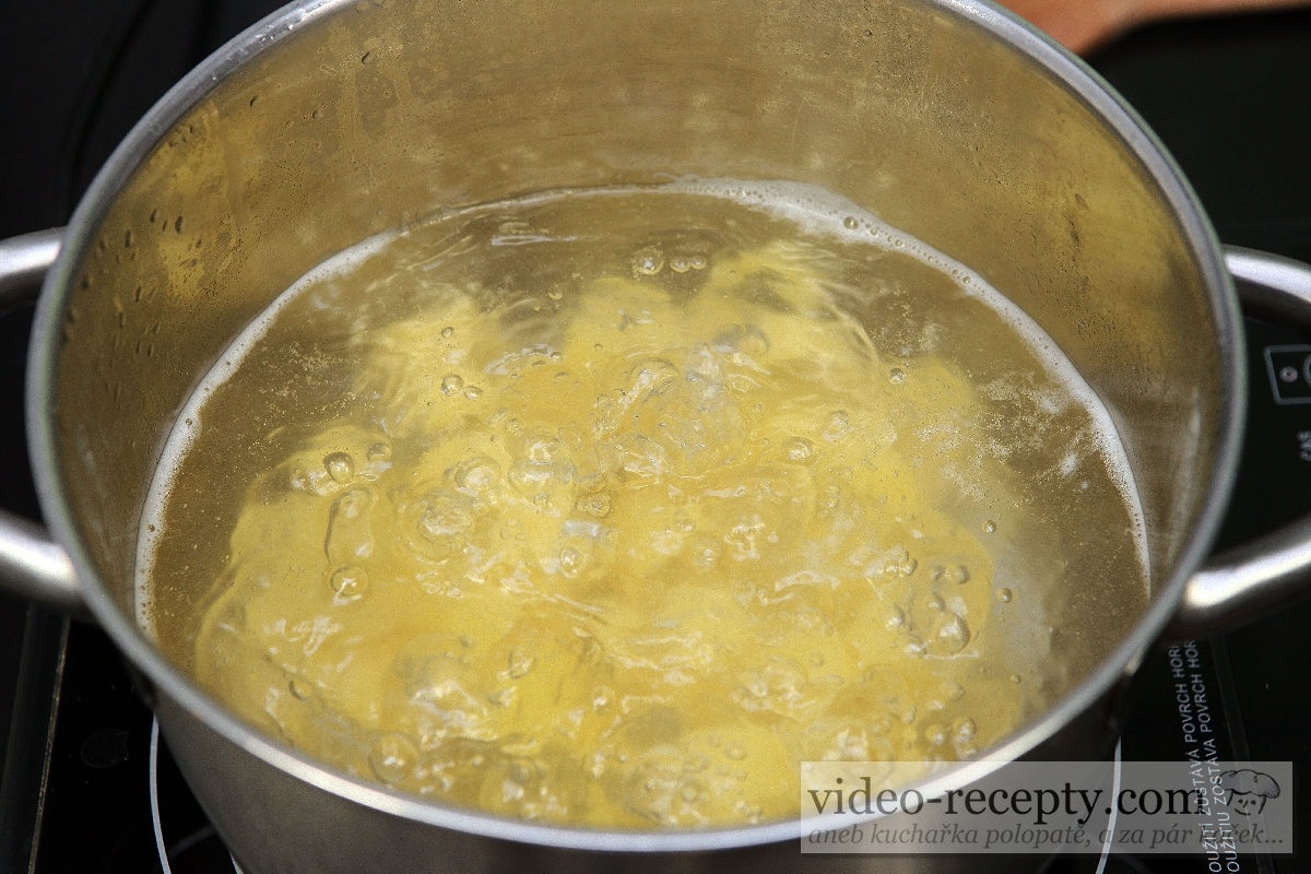 - Těstoviny s anglickou slaninou zahájíme uvařením těstovin ve dvou litrech osolené vodě. Pokud si nejsme jisti, kolik soli do vody dát, pak na 2 litry použijeme asi 1/2 lžičky soli, ale nejjistější je vodu ochutnat. Těstoviny vždy vaříme v dostatečném množství vody. Při slévání si vodu ponecháme, později ji budeme trochu potřebovat.