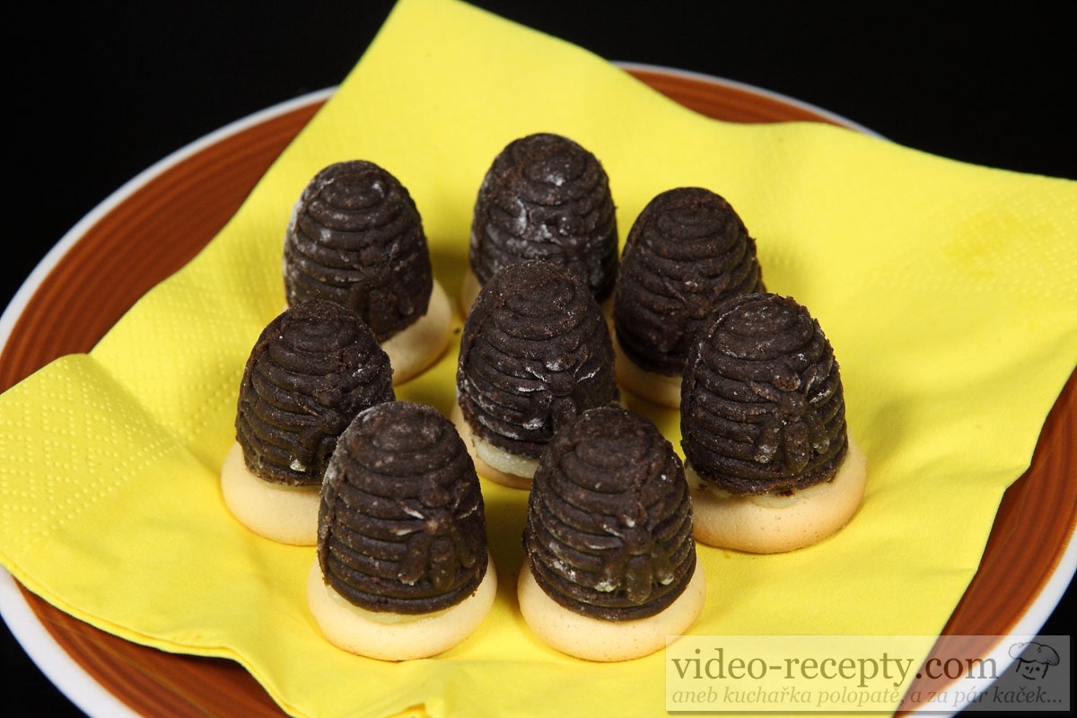 - Nemusíme dělat tučňáky složité tak, jako na naší fotografii. Stačí vosí úl namočit do polevy špičkou a podélně půlku úlu. Na bocích čokoládovou polevou přilepíme půlky mandlí, které simulují křídla. Další půlka mandle se vsadí do úlů tam, kde předpokládáme zobáček tučňáka. Oči můžeme udělat s barevných cukrářských kuliček, nebo i ze směsi na plnění úlů.
