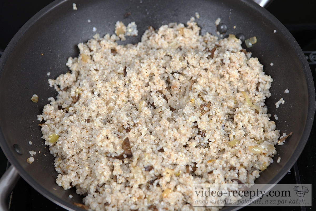 - Přidáme zcezené kroupy a pečlivě promícháme. Potom podle chuti dosolíme. Přidáme 1/2 lžičky mletého kmínu, 2 lžičky majoránky, 3 stroužky prolisovaného česneku a opět dobře promícháme.