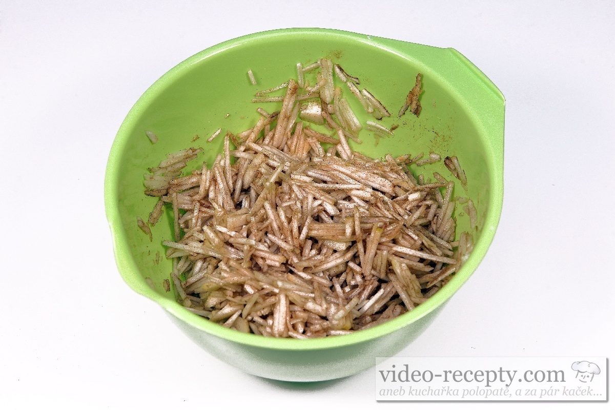 - Vánoční linecký koláč zahájíme nastrouháním jablek na drobné nudličky. Vložíme je do vhodné mísy a podle jejich kyselosti přídáme asi 2 lžíce cukru. Tato míra platí pro běžnou sladkost jablek. Dále přidáme balíček vanilkového cukru a lžičku mleté skořice. Vše dobře promícháme a náplň máme hotovou.