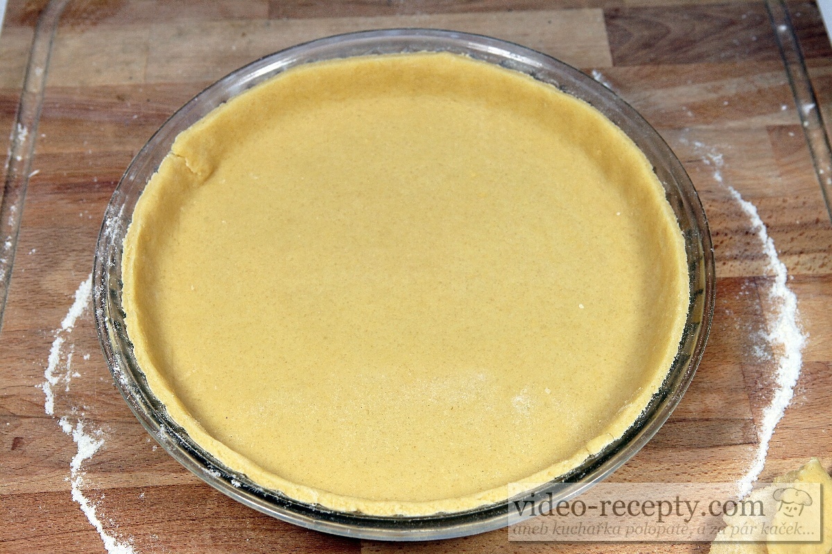 - Těsto natáhneme podle videa na váleček a přeneseme do formy. Usadíme ho tak, aby se všude dotýkalo stěn formy a přebytek ořízneme.