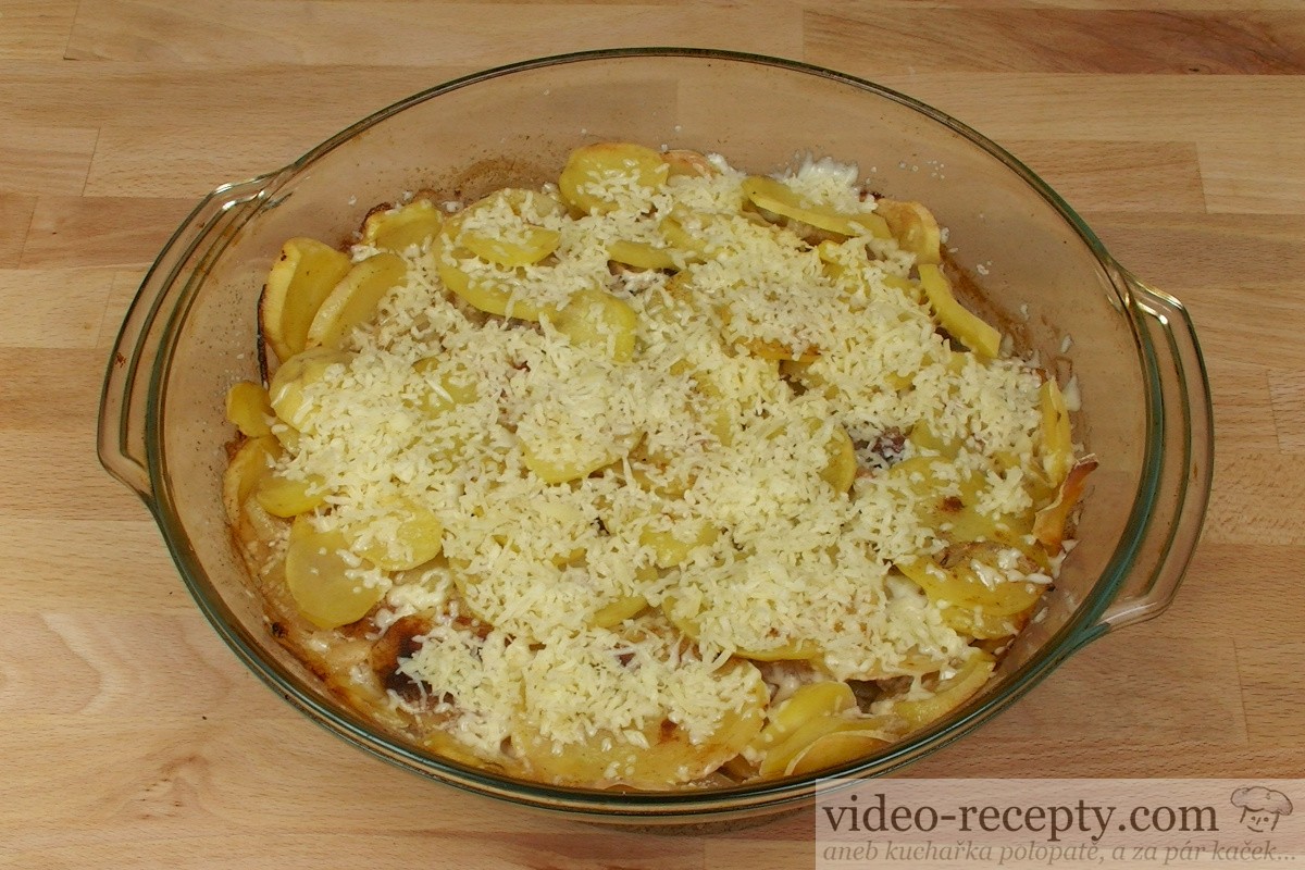 - Zakrytý pekáč dáme do trouby vyhřáté na 180°C a pečeme asi 1 hodinu. Pak zasypeme strouhaným sýrem a pečemé, dokud vše není měkké a povrch zlatavý.