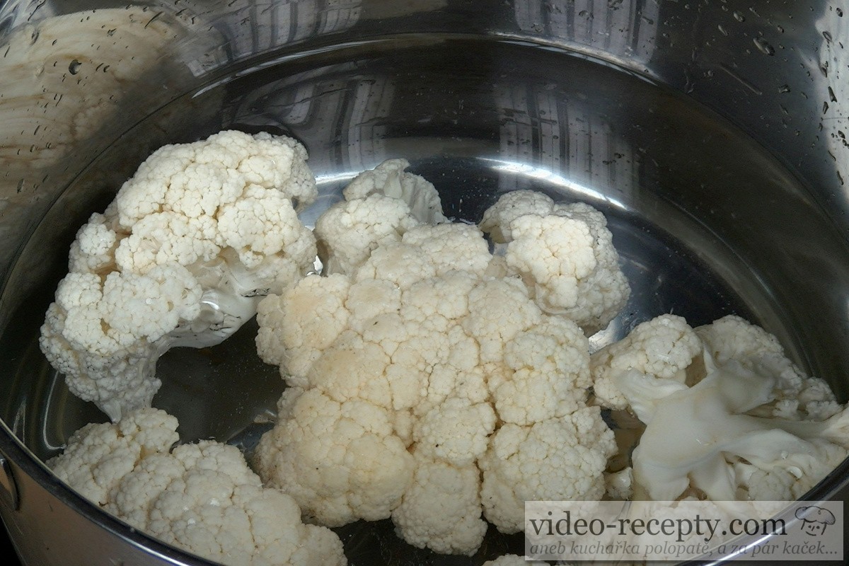 - 500 gramů květáku uvaříme do měkka. To bude trvat několik minut, podle toho, jak je dužnatá část široká, proto velké a dužnaté kusy květáku překrojíme na půlku. Po uvaření ho necháme vychladnout, a nakrájíme na drobnější kousky.