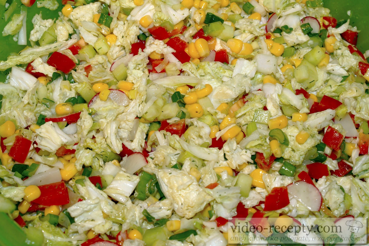 - Do misky dejte pokrájené čínské zelí spolu se všemi ostatními ingrediencemi, přidejte koření, ocet s olejem a promíchejte. Řiďte se pravidlem - čím tvrdší ingredience, tím ji krájíme na menší kousky.