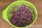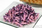- Zelný salát s jablky zahájíme nastrouháním zelí na drobné kousky. Také oloupaná jablka nastrouháme na drobnější kousky, váhově by jich mělo být stejně jako červeného zelí.